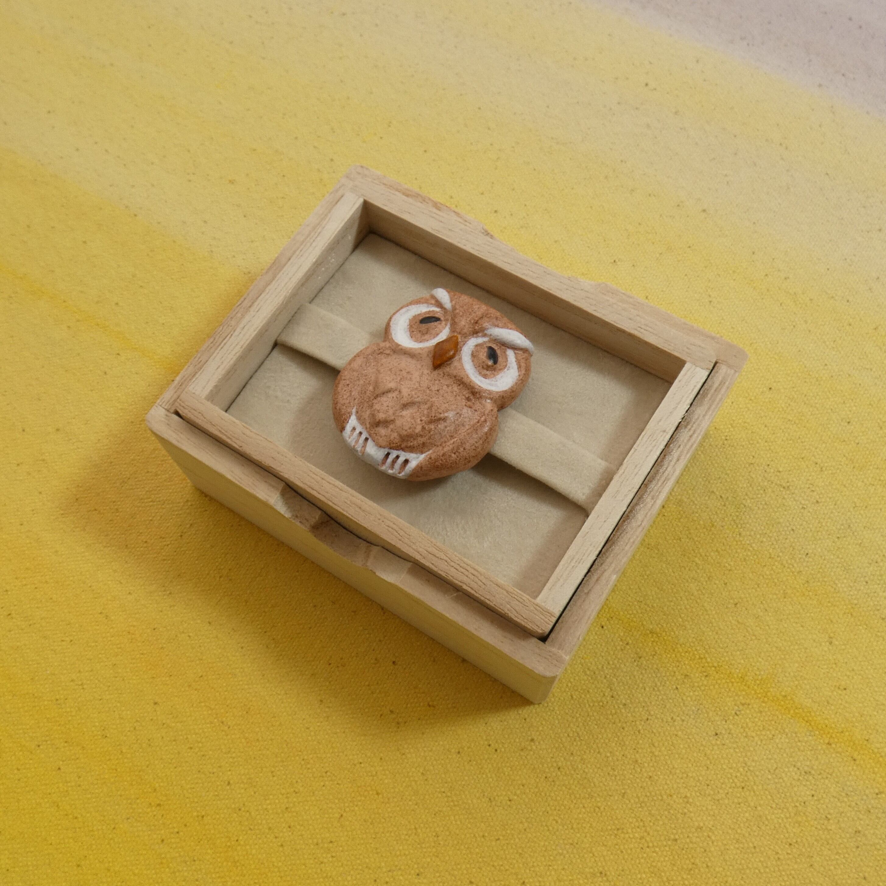 オーブン陶土で作った【ミミズクの帯留めとブローチ】です。