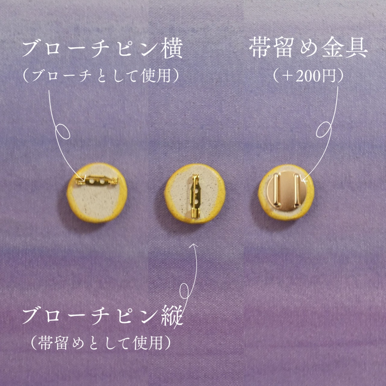 ※金具はオプションより「ブローチピンを横につける(ブローチとして使う)」と「ブローチピンを縦につける(帯留として使う)」、「帯留め金具(有料200円)」の3種類からお選びいただけます。