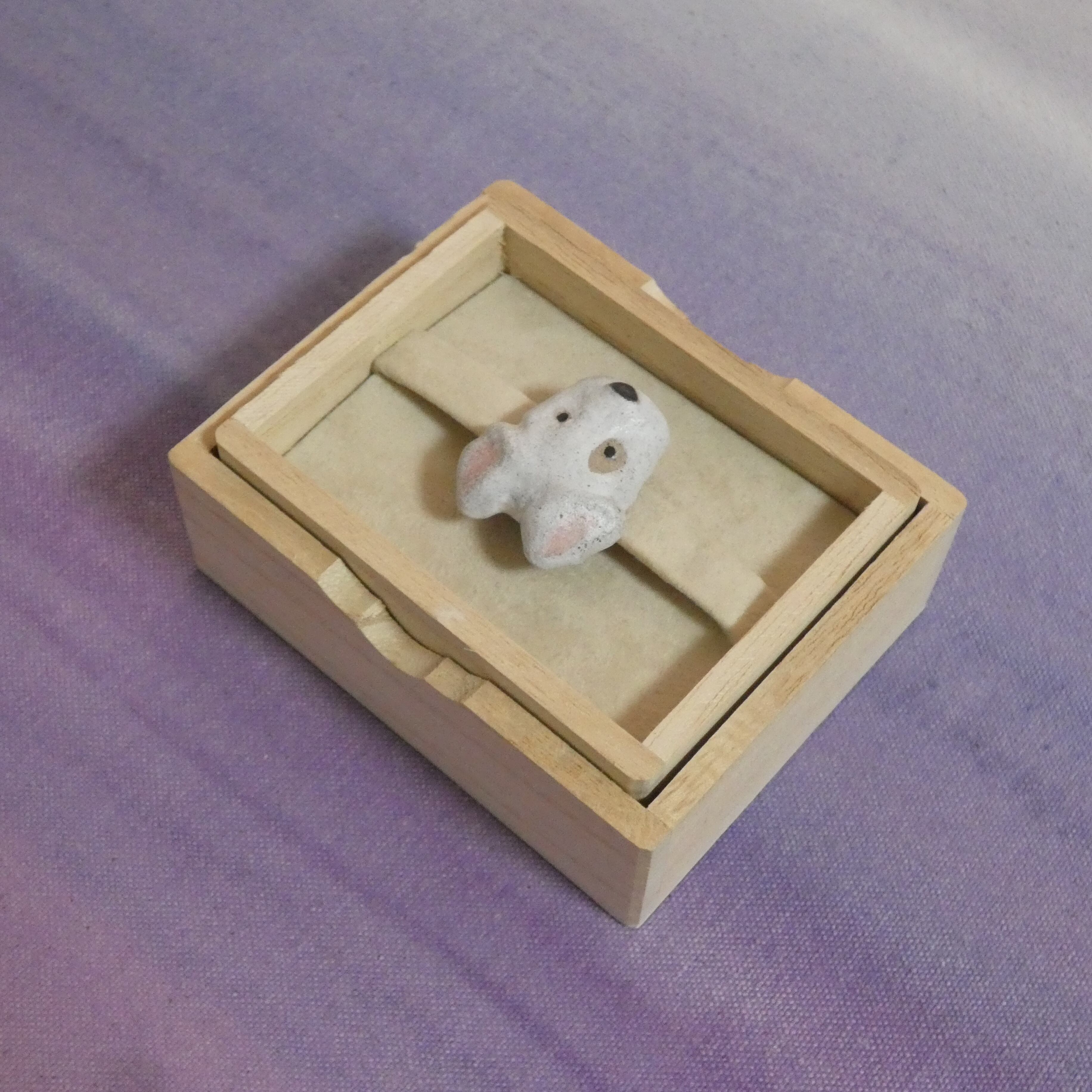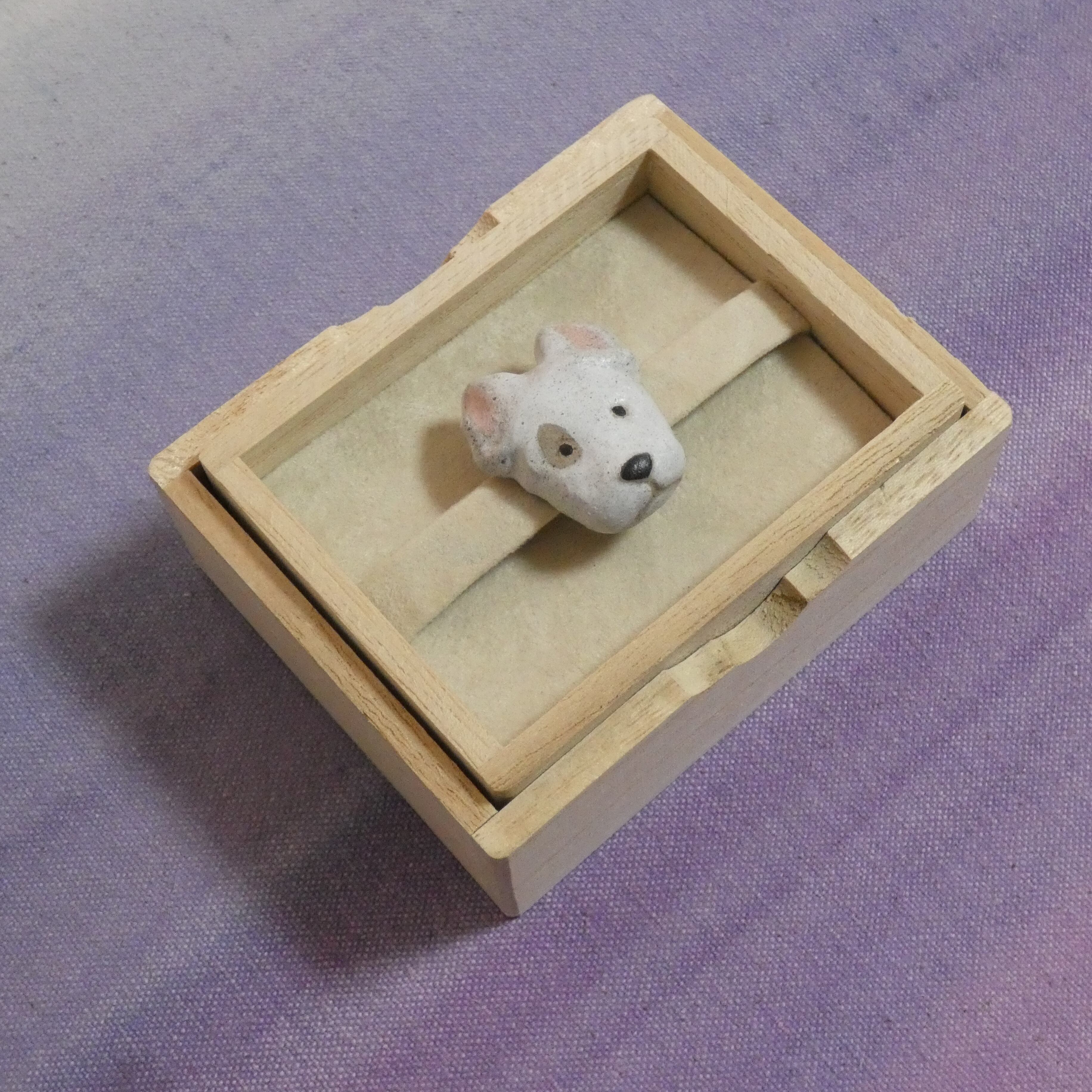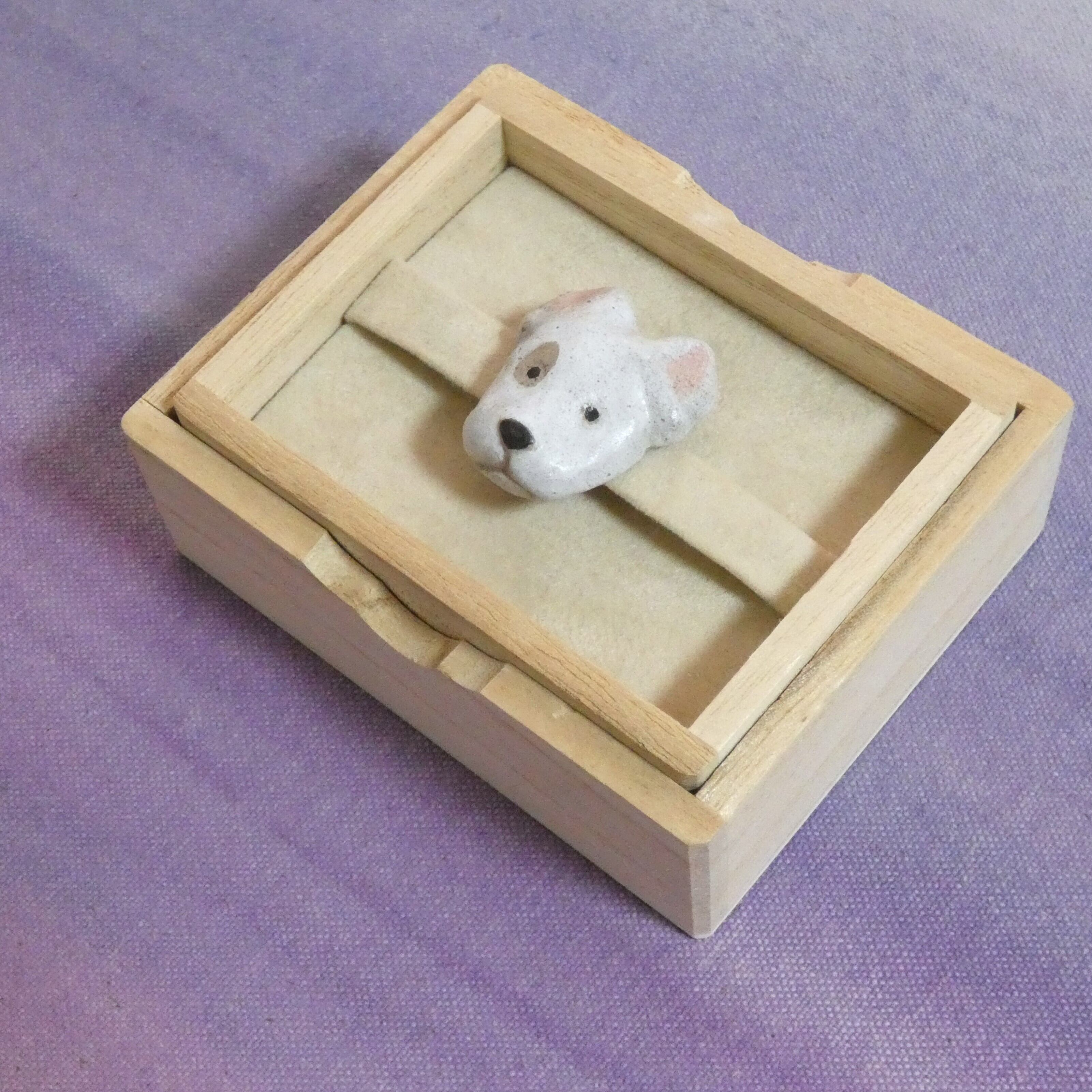 オーブン陶土で作った【犬(ブルテリア)の帯留めとブローチ】です。